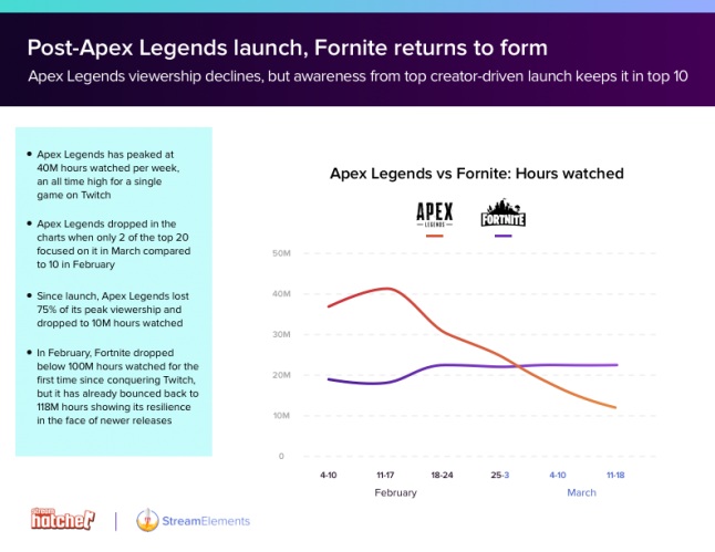 It’s a decline that StreamElements attributes to the shifting focus of the top streamers on each platform. According to the company’s data, 10 of the top 20 streamers focused on Apex Legends during February when the game hit its viewership peak. During March only two of those top 20 were still focusing on the game.