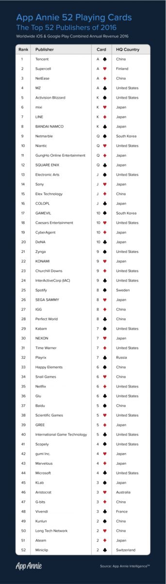 You can see the full list below, but the top 10 includes others notable names such as Activision Blizzard, Bandai Namco, Game of War creator MZ, and Japanese internet juggernaut, LINE.