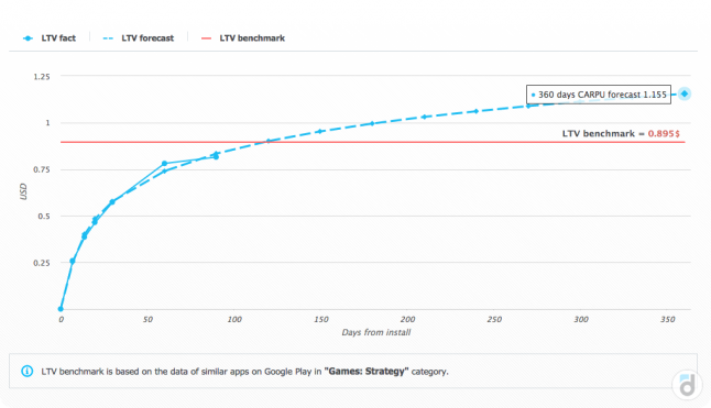 Finally, when Cumulative ARPU strives to infinity (or to some fixed point, say, 365 days), you get the value of Lifetime Value metric (LTV), which shows how much money one active user brings for the entire period of his stay in your project.