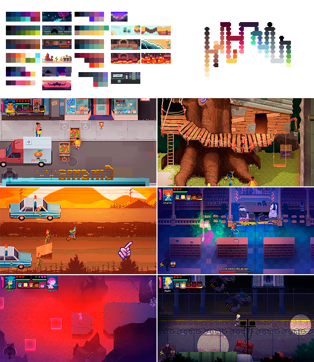 I usually do a minimalist color scheme before starting to create scenes in their final resolution to have a quick general vision of the full game palette. I wanted the player to feel like he/she was living the adventure of a lifetime by pushing them to leave the comfort zone behind. That sense that a lot of movies are reduced to this quote: “We are not in Kansas anymore…”. That’s why I ended up using so many colors in Crossing Souls.