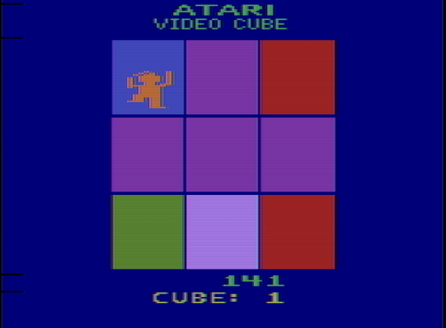 How you do this is how the game diverges from Ernő Rubik's portable conundrum. Your cube-living gremlin moves between the squares of the cube according to how you press the joystick. You only see one side of the cube, the one the elf is on, at a time. When you move them off the side of the cube, it "rotates," with a simple 3D effect, to show the next side. Your imp-person has free reign of the cube with one exception; they can change color through the game, but can never stand on a square that matches the color they currently are. You see, they're shown in relief against the background of the cube color they're standing on. If they were standing on a spot of the same color, they'd be invisible, and we can't have that!