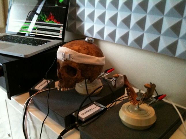 Of course, it was a bit tricky to work with the skull. I had to try many different contact microphones before I found one that worked well. But really the biggest challenge was that, when you transform sounds through an object like this, they come out initially sounding quite bad. So I had to do some amount of post-processing afterwards in order to make the sounds listenable.