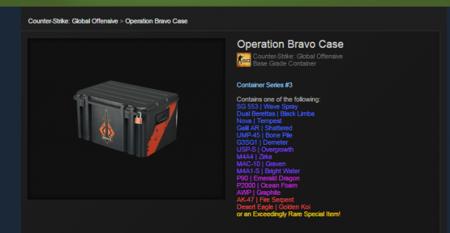 Next came the 2nd operation, Operation Bravo, where only people who bought the pass had access to a new set of maps for casual play and now competitive as well, but now there was the offer of a special case and skin drops only available to those who had access. Now the operation is being used as an add-on to the Skinner box element of the item drop system, the strategy to pay money in quickly to earn the skins and cases quickly to potentially make a good profit by selling cases and skins as soon as possible on the community market.