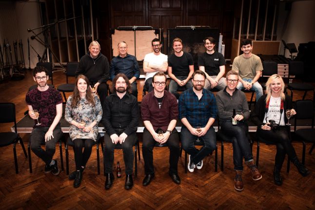 Recording crew on Ori and the Will of the Wisps. Front row: David Peacock (orchestrator), Jessica Kelly (score co-ordinator), Alexander Rudd (conductor), Gareth Coker (composer), Zach Lemmon (supervising orchestrator), Jake Jackson (engineer), Cassandra Brooksbank (film crew and closest friend!). Back row: Steve Kempster (engineer), Allan Wilson (librarian and copyist), Gianluca Massimo (assistant engineer), Alex Ferguson (recordist), Ashley Andrew-Jones (assistant engineer), Dakota Adney (film crew).