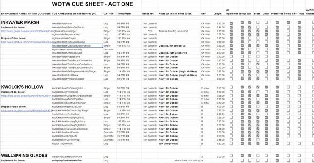 While it was my choice and design where and how the music is played in the game, the actual technical nuts and bolts of making it playback in the game, I did precisely none of that! That was all Guy. I am not a composer who likes to get lost in Unity and Wwise. I prefer to create content and think about it’s role in the game. But, I do understand how to communicate with the people who do have the task of getting my music to play in the game. I provided Guy with my gameplay videos with music overlaid on top, and captions of what music track I wanted to play, and where each musical shift/switch was. I’d also provide a PDF that went into more detail on what was happening in the video. This combination usually gave Guy no doubt in to how the music should be implemented and if my explanation was unsatisfactory, I was a Skype window away. Between all of this and the cue sheet, we made sure that enough information was readily available to keep track of all the cues.
