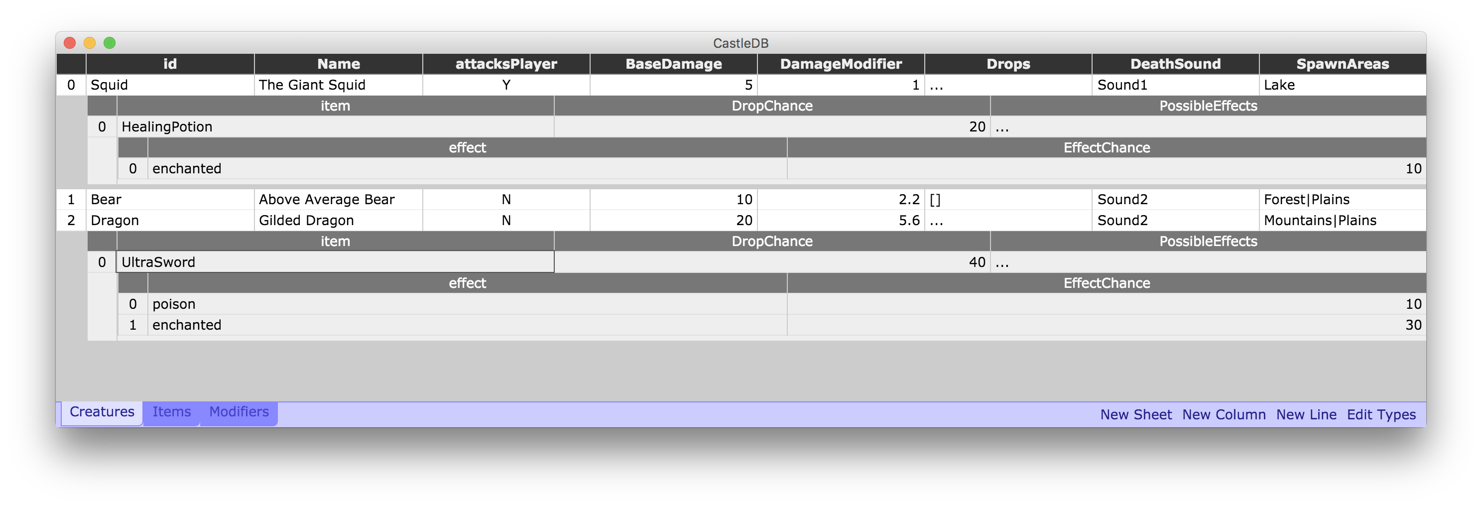 CastleDB is, in short, a JSON editor that makes working with JSON feel more like working with a traditional spreadsheet. It’s also made with the explicit purpose of being a “database editor for games”. It was created by Nicholas Canasse, a relatively prolific game developer who is probably better known as the creator of the Haxe programming language (which is also what CastleDB is written in).