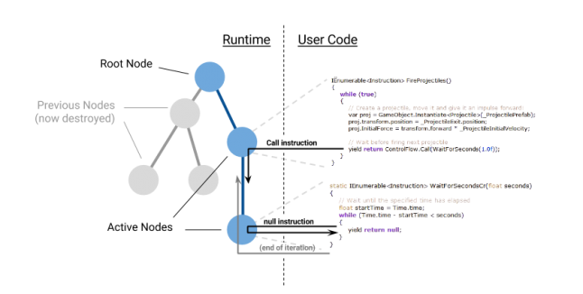 Behind the scenes, the framework is building a graph structure. The runtime executes the user code, until the user code yields an instruction, and then the runtime interprets that instruction accordingly. Depending on the yielded instruction, the runtime can create different kinds of sub nodes. The most common coroutine node is the one that executes an IEnumerator<Instruction> iterator.