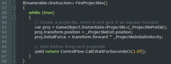 A coroutine can also yield a Call instruction, passing in another coroutine. This is in fact what the FireProjectiles() coroutine of our turret does to wait between firing projectiles.
