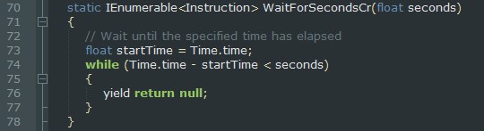 This is the utility coroutine that waits for a specific amount of time. It just sits in a loop checking the time since it was first called, and yields null. Once the time has elapsed, it simply terminates. null is interpreted by the framework to mean ‘sleep until next frame’. (Note: it is the exact same meaning as it is for Unity’s coroutines. How convenient!)