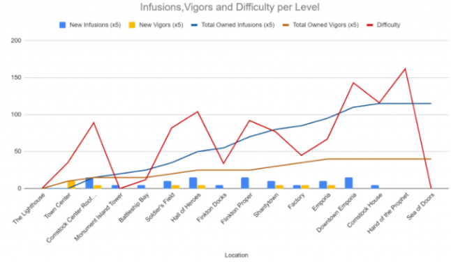 Similar rule applies to Infusion: The Infusions’ curve is almost linear, providing sustain to the player dealing with the difficulty of the game and giving him choices to make (which stat to upgrade), allowing him to sustain his playstyle (self-expression via playstyle) ; Getting higher stats(4) through the game helps him with the increasing difficulty of the end-game.