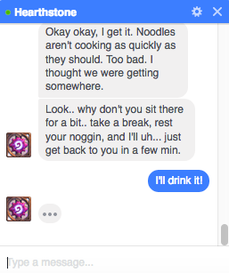 As it turns out, it’s Blizzard who has the answer. If you scroll on over to the Hearthstone Facebook page right now, and click the “message” button, you can start chatting with a goblin innkeeper named Talan, who’s a little eager to reverse the typical bartender/patron relationship and starts spilling some secrets.