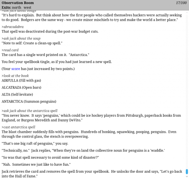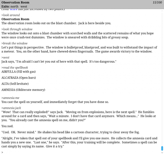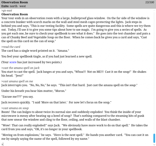 “Some of this is due to the removal of size restrictions. Remember that the first ZIL games had to run in 64K of memory, and even the later ones had only 128K. This severely restricted, for example, the number of synonyms you could have for any given object,” Bates says.