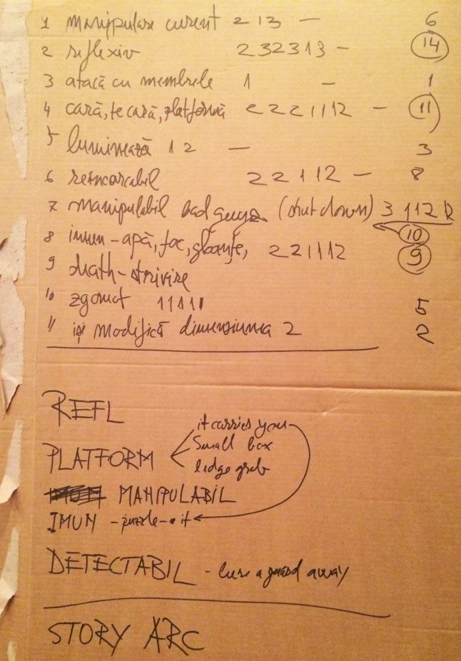 At this stage each of us votes, but there is no debate on it. Each person carefully ponders and independently assigns points based on what he thinks is best for the game, it can be better implemented or just what he likes best. In our case it was almost unanimously left out to have our pet crushed or to have him attack with his legs. Not because they were poor characterists, but because they would rule out better ones (e.g.: if the pet can be crushed, then you can't use it to hold a heavy door, object or Black, himself).