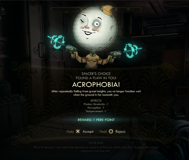 Spacer's Choice, one of The Outer Worlds' fictional megacorporations, had found a flaw in me. They think I have Raptophobia or the fear of Raptidons due to repeated encounters with the beasts. I can choose to accept the penalties associated with the flaw in exchange for a point--one I can use to unlock one of the several perks that give my player character things like more health or bag space. Or I could just decline the choice altogether and move on.