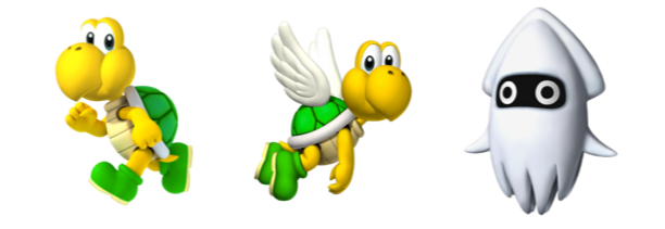 We can illustrate these notions taking some examples from Super Mario. For instance Koopas move in a straightforward fashion until they hit an obstacle and reverse their direction. Although they initiate their movement spontaneously, further changes in their trajectory are induced by the environment. They score low both on spontaneity and directedness, because their movement is almost entirely constrained by the ground on which they evolve. As a result their behavior is rather dull and predictable. Paratroopas have a more interesting behavior: because they are not constrained by the ground, they do not move in such a straightforward way. Instead they oscillate slightly on an otherwise rectilinear trajectory. Bloopers are even more interesting. They score high on spontaneity as they often change direction, and they score relatively high on directedness as they maintain a rectilinear trajectory for a few seconds before changing direction.