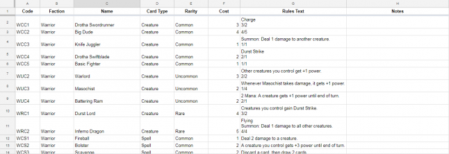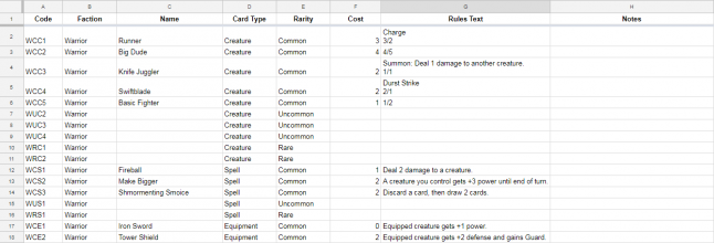 By the end of stage 1, I recommend filling out your commons first if you have a rarity system. Why? Because commons are the hardest cards to design. They have to be weaker and less complex than the rest of the cards, which makes them more restrictive. You may find that as a result of those restrictions, some of your mechanics don't work well or at all at common. If you don't have a rarity system, then just try to create a healthy amount of every card type. You can start playtesting immediately after the card file is filled in to this point.