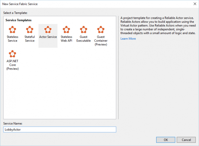 For the initial service fabric service, select the Actor Service template.