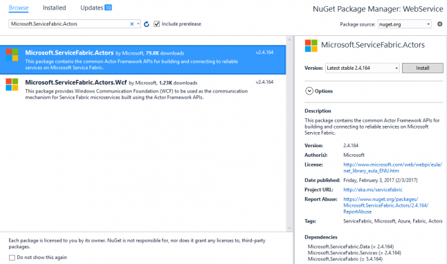 NuGet is the package manager for Microsoft and .NET applications. Switch from Installed to Browse, and enter Microsoft.ServiceFabric.Actors. Installing this package into our web service will allow it to properly communicate with the actor we created in the previous part of this blog series.