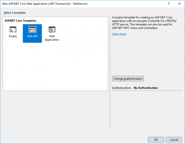 In the next dialog, select the Web API template. We don't need a full-blown web application here, because we won't access our services from the browser.