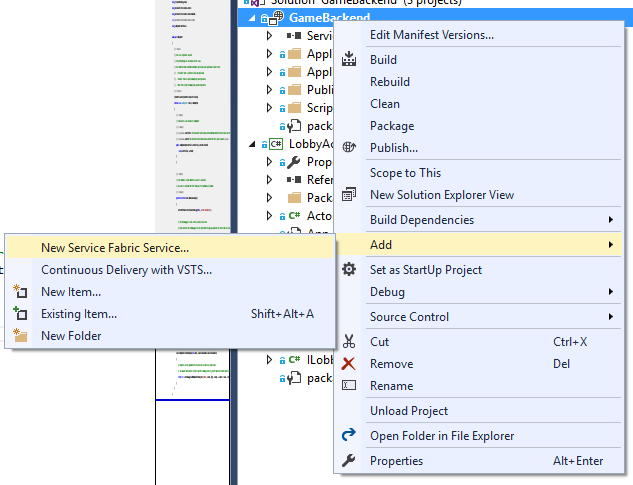 Back in Visual Studio, in the Solution Explorer, right-click the backend Service Fabric project, and select Add > New Service Fabric Service...