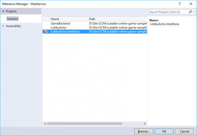 Also, our web service needs to know about how to communicate with our respective actors. Remember? That's what the LobbyActor.Interfaces project was created for. These interface projects provide an API for other services to use, without exposing any of the actual service implementation details. Right-click the web service project in the Solution Explorer, and select Add > Reference... Tick the LobbyActor.Interfaces project and confirm the selection by pressing OK.