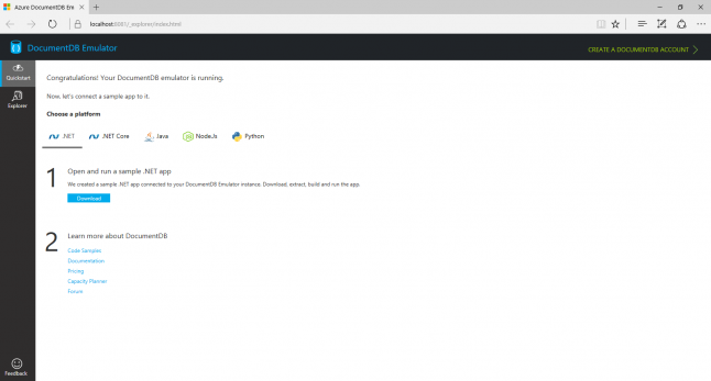 As always, it is very important to be able to setup and test everything locally first. Download and install the DocumentDB Emulator. After successful installation, the dashboard should open up in your browser. You can also open it by right-clicking the icon in the system tray and selecting Open Data Explorer...