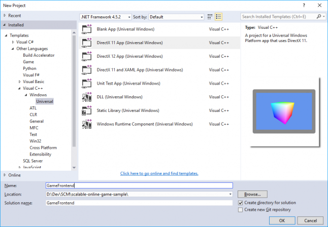 Select DirectX 11 App (Universal Windows).