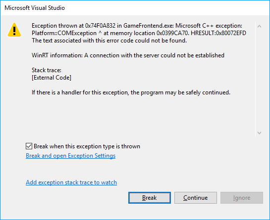 If we run the application again now, Visual Studio might show an exception window. This might happen especially in the case of us not having the backend up and running.
