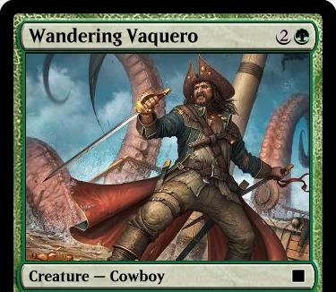 It’s called Wandering Vaquero and it’s a cowboy creature so…is it a cowboy? In my own fantasy world, simply declaring it one makes it so, because it’s my own fantasy world. But if I want people to buy into my fantasy I need to conform to certain common ideas, which this card most certainly does not do. The game recognizes it as a cowboy and I can shout “This is a cowboy!” as loud as I want, but pretty much everyone who sees this is just going to say “Nah, that’s a pirate.” This matters to designers because flavor, as I established earlier, is about representation. It only works if you and the player both agree on what it is that you’re representing.