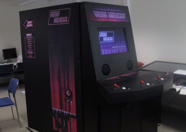 It may look like a normal arcade game from the front, but Neon Nemesis has a secret… a hidden entrance behind the arcade booth. Those who enter find the lair of the Nemesis; a dark room with a screen, chair, and a plethora of controls, including: a rope, crank, lever, pedals, and various buttons of diverse shapes and sizes.