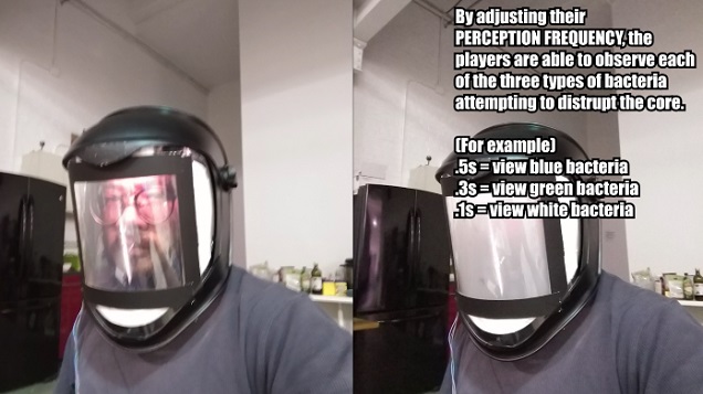 In this interview creative lead Henry Lam talks about how (and why) Continuum Bacterium uses two custom-made face shield 'controllers' paired with two custom fabricated control panels. In order to give each player their own "split-screen", the face-shields flicker a voltage-dependent privacy film at (safe) varying rates.