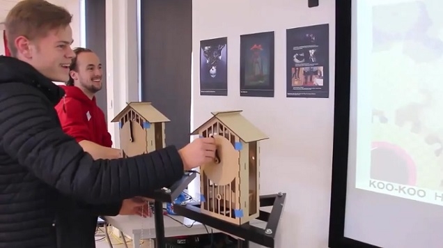 The interaction contains visceral pulling on weights and finely setting the hands of the clock. The gears inside the mechanism resist pulling and rattle along with the movement of the birds. All in all this creates a frantic multiplayer game where you are never really in control.