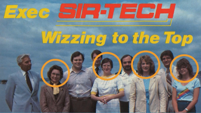 A photo Romero shared of Sir-Tech staff at the time she was hired. From left to right: Sir-Tech president Fred Sirotek, Janice Woodhead, Robert Woodhead, Robert Sirotek, Jean Bromley, Peter Bresett, Lynn Dupree, Norman Sirotek, and Linda Sirotek