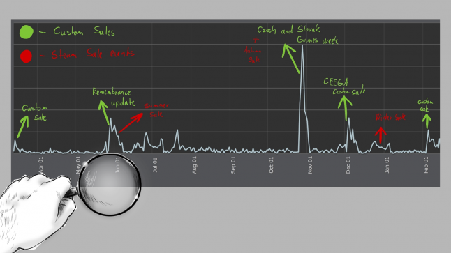 We also started building narratives in our marketing. So instead of Definitive edition, we called it the Remembrance Update to draw attention to the historic vibe of our game. Instead of general sales, we do “History in Focus” sales and alike. Every part of your game’s image is important! What you can see from the following table is that custom sales are much more important to our revenues than regular Steam sales. With the exception of Autumn Sale (33% discount) and the first Custom sale in March, our discounts were always set between 50-54 %. The huge spike happened thanks to the initiative of Czech Games Developer Association organizing a Czech and Slovak Games week on Steam, which significantly helped our sales