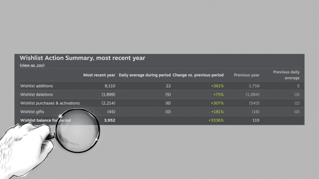 We assume that one of the reasons why new players keep on finding us is the fact that we still have a lot of wishlists. Some of those people are activated by every sale. So even though the game has been in a few sales at more than 50% off, we still have a 5-digit number of wishlisted. In fact, we are four times more successful regarding the collection of new wishlists this year than during the previous one. However, we are able to convert only one quarter of them to purchases. We will be happy to hear any tips or advice on how to work with them other than increase our discounts.