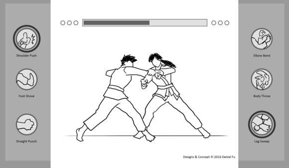 This design focuses on a group of grappling-style fighters set in a turn-based game system. Each player selects a move at the same time (possibly using a countdown timer) from a short list of possible moves.
