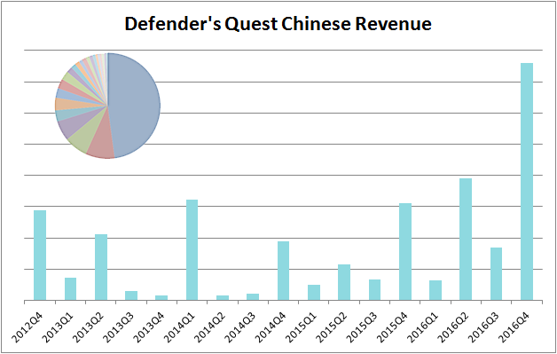 At the time, China was still a very small slice of our overall revenue (as you can see in the graph's embedded pie chart -- it's the tiny turquoise slice at the very top). Still, it was enough evidence to start localizing Defender's Quest into Simplified and Traditional Chinese.