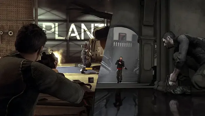 In shooters it’s common for the screen to go red, or black and white, when the player receives a lot of damage and is in danger of dying. The Splinter Cell franchise turns that paradigm on its head and desaturates the color around the player while they’re safely in the shadows, only showing them in color if they are discovered or otherwise break stealth.