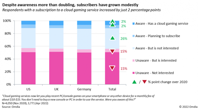 ,In April 2022, Omdia polled over 3,700 consumers in the US, UK, and Germany to gain insight into their awareness and uptake of cloud gaming services. Compared to our findings from a similar survey in November 2020, there has been a surge in awareness of cloud gaming services, but the number of subscribers has remained modest – yet again highlighting the nascent, but rapidly-developing state of the cloud gaming market.