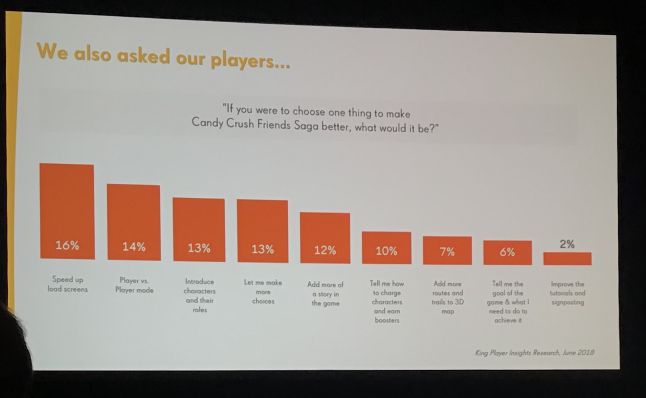 It’s a question John discovered Candy Crush’s players were asking as well. She shared an image of a survey King conducted with 900 or so members of its playerbase and highlights that 13 percent wanted characters and roles introduced in-game and 12 percent all around wanted more of a story in their Candy Crush games.