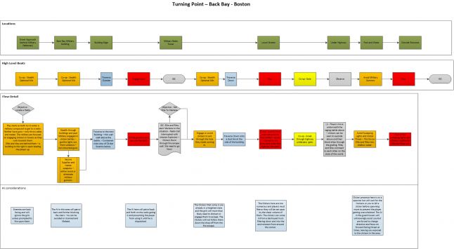 Created a flow with more detail that handles any logic branches, epic moments or cutscene events. This will also allow you to get a greater understanding of your pacing. Narrative moments should almost exclusively be focused around down beats. Avoid pushing the player into combat and competing with your narrative moments.