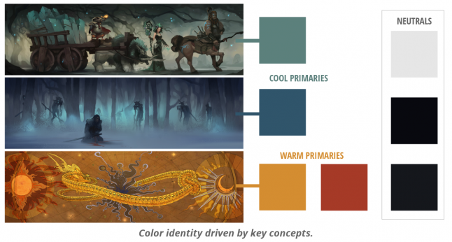 “Survival” is a key component of Crowfall’s premise, and many of the initial concept paintings provided by artists Dave Greco and Allison Theus depicted a frozen and decaying world. When choosing the color palette, I leaned heavily towards neutrals and cool blues to help convey that tone. Traditionally, warm colors are used for major headers and primary call-to-action buttons.