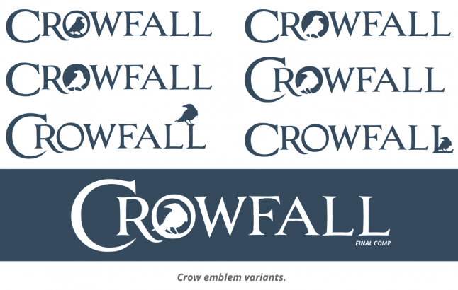 We liked the idea of embedding a crow silhouette somewhere in the logo, so I played around with that concept in various poses and configurations to find which had the strongest impact. We finally settled on the idea of the crow embedded inside the “O” of Crowfall, because we liked the balance -- and, as a bonus, it also gave us a great “abbreviated” version of the logo that would be recognizable to fans and would work great in other venues (much like the iconic Nike swoosh or Target’s red bullseye).
