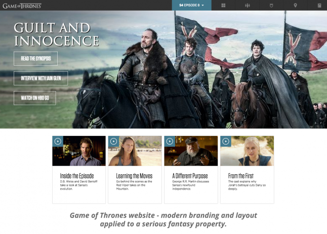 Instead, I took inspiration from the Game of Thrones Viewer’s Guide website. The bold, simple and modern framing does nothing to detract from the gritty fantasy world of GoT. The negative space created by its minimal scheme actually allows the photos and video clips to pop more than if they were surrounded by ornate details.