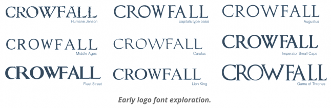 Once we established the core elements for Crowfall, I set out to design a logo that could support those traits. I began by scrubbing my font database for any typefaces that evoked the look and feel I wanted; this usually gets me 75% of the way there. I remember being inspired by the fonts used in Assassin’s Creed, Game of Thrones and Skyrim. I think they all do a good job of establishing the mood that I was trying to tap into: Crowfall needed to feel like a fresh, modern and mature fantasy property.