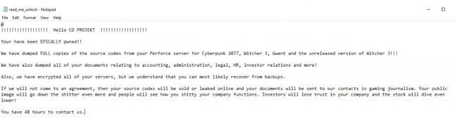 "An unidentified actor gained unauthorized access to our internal network, collected certain data belonging to CD Projekt capital group, and left a ransom note (pictured below) the content of which we release to the public," reads a studio statement.