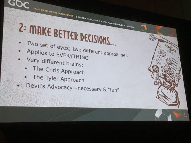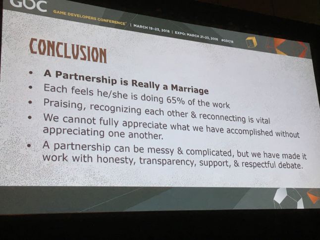 As part of the talk, the pair shared some "golden rules" for partnerships in games (or anything, really.) The number one rule? Don’t let anything fester