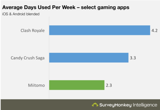 Clash Royale players, for example, spend an average of 4.2 days per week on Supercell’s strategic tower defense title. Miitomo users, however, spend just 2.3 days on average on Nintendo’s debut effort.