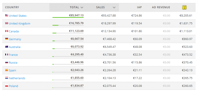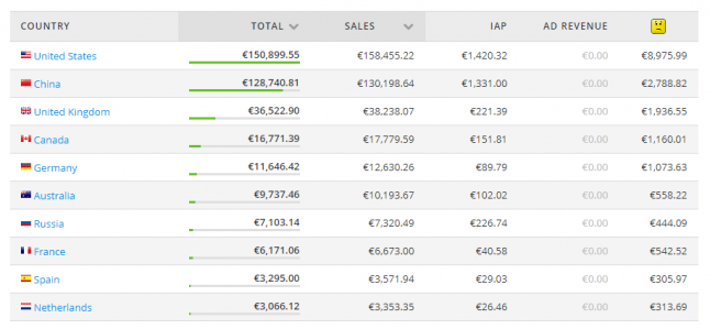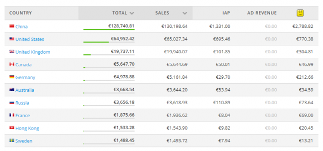 Different countries' performance maps pretty closely to the regional sales we see on PC. The US has always been our biggest market - Americans love a bit of olde-worlde Englysshe charm - but there’s a particular point about China to make.