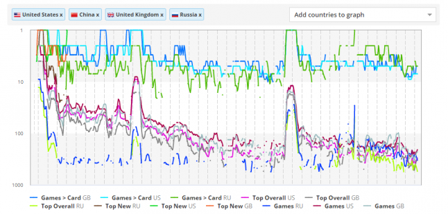 The US on top, as you’d expect, closely followed by China. The other countries - the UK, Canada, Germany, all of which rank roughly in this order on PC - are but a fraction of the revenue generated from the top two countries.